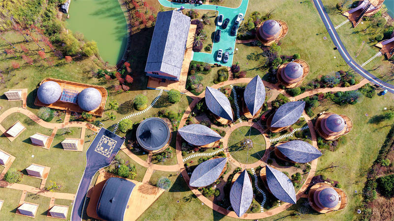 峡江县金坪民族乡蝴蝶泉野奢营地,特色民宿与田园、群山互相映衬,构成一幅和美乡村生态画卷。宋靖辉摄