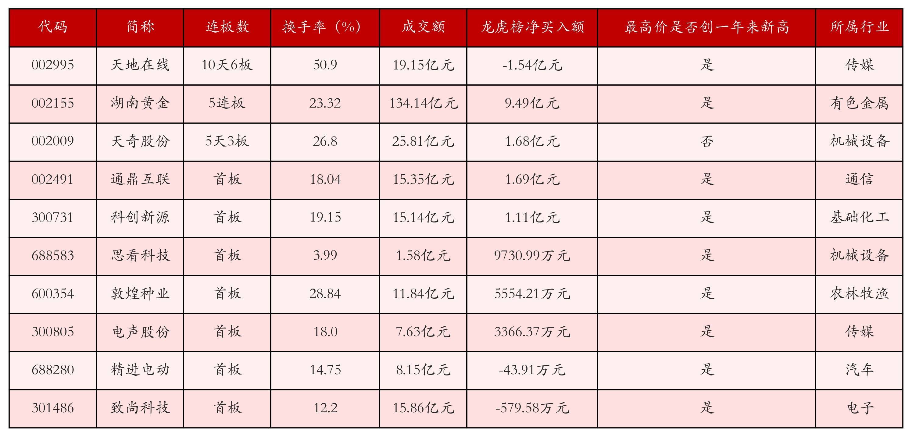 截至1月30日收盘,上证综指下跌0.96%,收于4117.95点,深证成指下跌0.66%,收于14205.89点,创业板指上涨1.27%,收于3346.36点。今日沪深两市A股共计59只涨停,综合当前连板数以及当日龙虎榜数据,其中较为强势的前三只个股分别为:天地在线(002995)、湖南黄金(002155)与天奇股份(002009)。今日强势个股前10位具体数据见下表:
