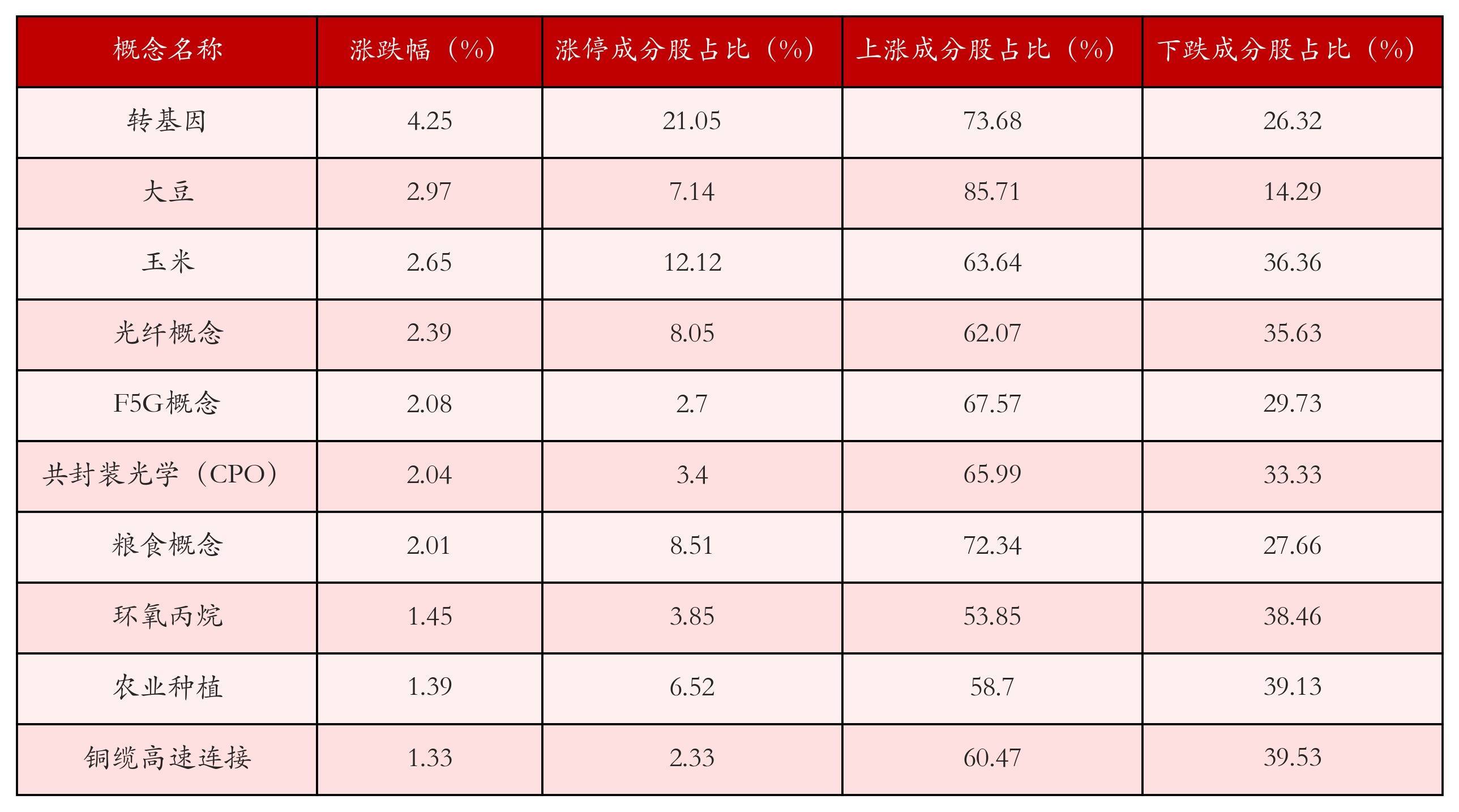 根据A股概念涨跌幅与所对应的股票池综合分析,涨幅靠前的三个概念板块分别为:转基因、大豆与玉米。排名前10位的概念板块相关数据见下表: